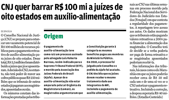 CNJ quer barrar R$ 100 mi a juízes de oito estados em auxílio-alimentação