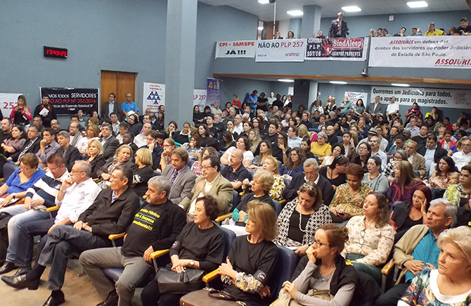 De iniciativa do deputado Carlos Giannazi (PSOL) com o vice-presidente da Assojubs, Luiz Milito, a Audiência Pública lotou o plenário e a manifestações dos funcionários públicos presentes foram todas no sentido de ressaltar a união para lutar contra a retirada de direitos contida no PLP.