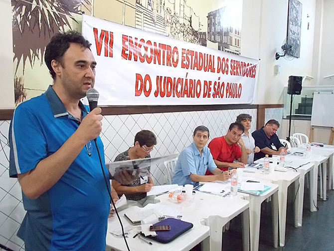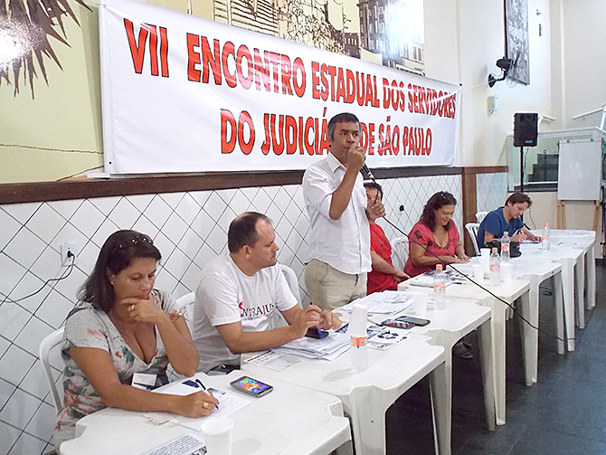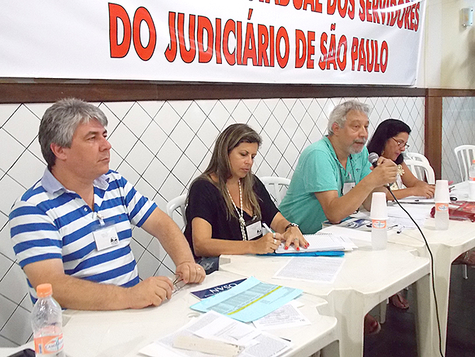 Na sequência, ainda no período matutino, Adilson Rodrigues dos Santos, coordenador geral da Fenajufe (Federação Nacional dos Trabalhadores do Judiciário Federal e Ministério Público da União), Ana Luiza de Figueiredo Gomes, diretora de base do Sintrajud (Sindicato dos Trabalhadores do Judiciário Federal no Estado de São Paulo), Michel Iorio e Regina Assis, presidente e secretaria geral da Assojubs, e Alexandre dos Santos, diretor jurídico do Sintrajus, compuseram a segunda mesa de trabalho do VII Encontro Estadual.