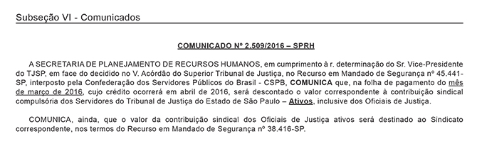 Nesta terça-feira, 8 de março, o Tribunal de Justiça do Estado de São Paulo publicou no Diário da Justiça Eletrônico (DJE) o Comunicado Nº 2.509/2016 - SPRH informando aos servidores que na folha de pagamento do mês de março, cujo crédito ocorrerá em abril, será descontado o valor correspondente à contribuição sindical compulsória dos servidores em atividade do TJ-SP.
